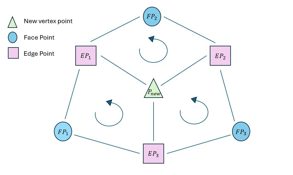 Through following this approach, I have shaped my new faces. At the end of this process, faces are quad faces whose vertices are P_new, EP, FP, P_new. Before drawing them, each face is triangulated.